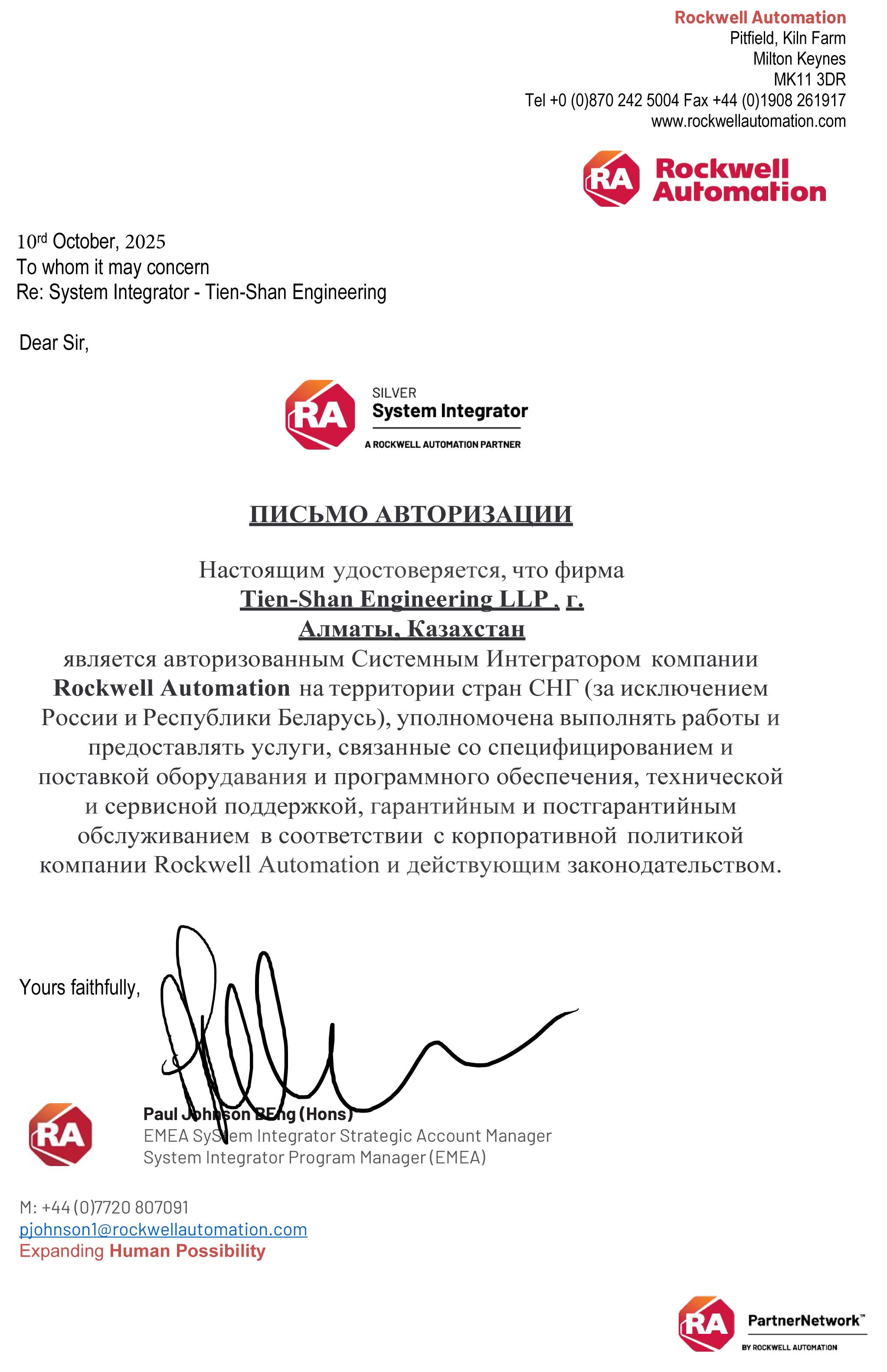 Rockwell Atomation. Письмо авторизации.